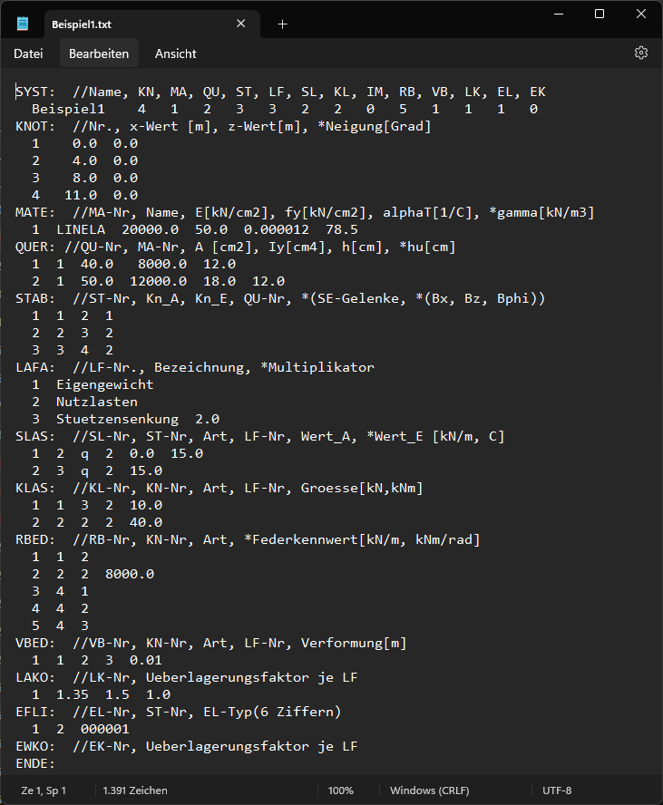 SYST: | SYSTEMDATEN Hierin werden in einer Nachfolgezeile alle wichtigen Parameter beispielsweise über die Anzahl der Systemknoten, der Stäbe, der Randbedingungen und der Lasten eingegeben. Die Reihenfolge der Steuerparameter ist festgelegt und ergibt sich wie folgt: frei wählbarer Namen für das zu berechnende Tragwerk, die Anzahl der Knoten, die Anzahl der Werkstoffe, der Anzahl der unterschiedlichen Querschnitte, die Anzahl der Stäbe, die Anzahl der Lastfälle, die Anzahl der Stablasten und der Knotenlasten, die Anzahl der Randbedingungen (jede Bindung zählt), die Anzahl der eingeprägten Auflagerverformungen, die Anzahl der Lastkombinationen, die Anzahl der Einflusslinine und schließlich die Anzahl der Einwirkungskombinationen. Einwirkungskombinationen werden grundsätzlich sowohl nach Theorie I. als auch nach Theorie II. Ordnung berechnet.Die Abfolge der Systemparameter ist bei der Eingabe zu beachten.