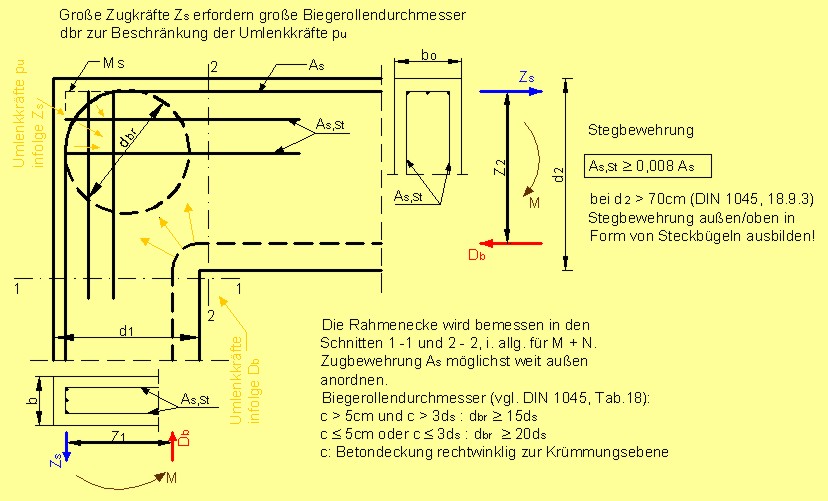 Wird eine Rahmenecke durch negative Momente beansprucht, so bleibt die ausspringende Ecke spannungslos. Die Zugbewehrung sollte daher in diesen Fällen mit großem Biegerollendurchmesser dbr gebogen werden. Hierdurch werden auch die Spannungen zwischen Beton und Stahl sowie die Querzugspannungen vermindert. An der inneren Ecke wird die erforderliche Umlenkung (Þ Umlenkkräfte) der Biegedruckkraft durch kleine Schrägen erleichtert.