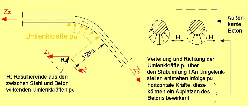 Wie in folgender Zeichnung angedeutet ist, entstehen an allen Krümmungen von Stählen Spannungen zwischen Beton und Stahl, die um so größer werden, je kleiner die Krümmungsdurchmesser sind. Diese Spannungen erreichen sehr rasch Werte, die oberhalb der Würfelfestigkeit liegen.