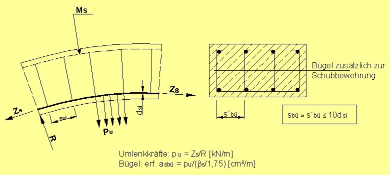 Bei stetig gekrümmter Führung der Bewehrung am inneren Zugrand ist zu unterscheiden, ob eine starke oder eine schwache Krümmung vorliegt. Bei starker Krümmung müssen Umlenkkräfte durch Bügel aufgenommen werden. Diese Bügel nehmen gleichzeitig die nach außen gerichteten Abtriebskräfte der Biegedruckkraft auf.