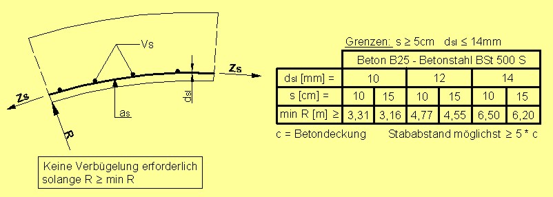 Bei schwacher Krümmung (häufig bei Treppen anzutreffen!!!) darf die Zugfestigkeit des Betons zur Aufnahme der Umlenkkräfte in Ansatz gebracht werden. In folgender Zeichnung sind die sich hiernach ergebenden Mindesthalbmesser min R für einige Stababstände s und Stahldurchmesser ds ausgewertet.
