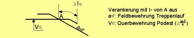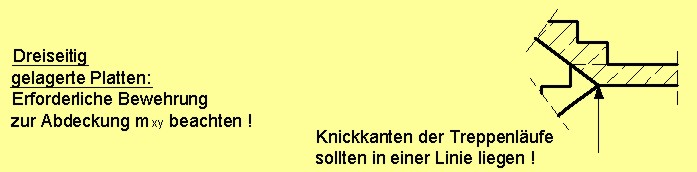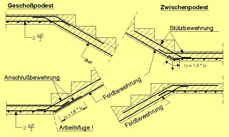 Die Grundsätze der Bewehrungsführung für geknickte Bauteile gelten für Treppen sinngemäß. Aufbiegungen der Feldbewehrung sollten vermieden werden, da das Herstellen von mehrfach gebogenen Stäben (Knickkanten !) meist unwirtschaftlich ist.
